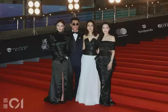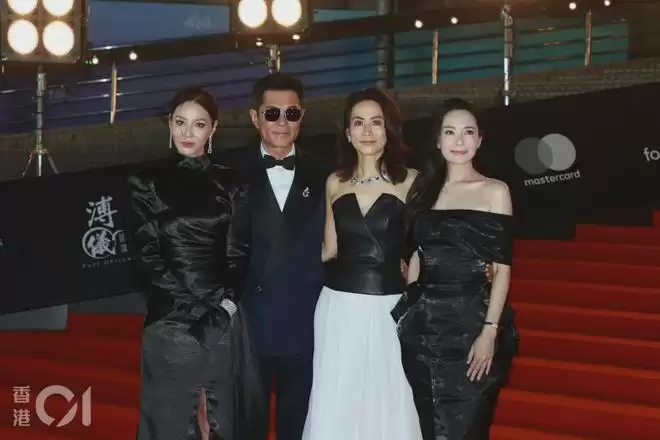 古天乐与滕丽名、宣萱、郭羡妮于红毯合影。(叶志明摄)
