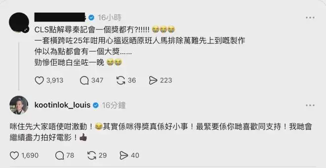 古天乐在社交媒体呼吁影迷保持平和,强调:“得奖真是小事!最重要的是你们的喜欢和支持!我们会继续尽力拍好电影!”(Threads)