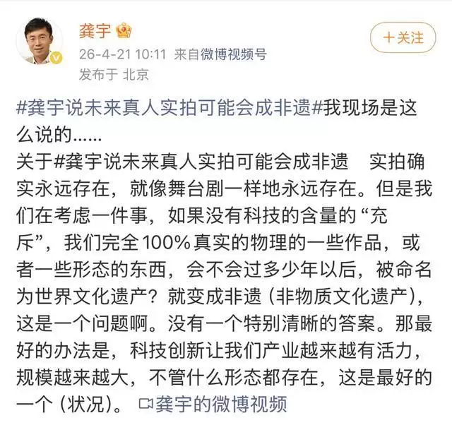 针对此前“真人实拍或成非遗”的言论所引发的轩然大波,龚宇也进行了语境还原。他表示,实拍就像舞台剧一样,将作为一种艺术形式永远存在。行业真正需要思考的是,随着科技渗透率越来越高,未来那种完全依赖物理实拍的制作方式,是否会因为其稀缺性,而被赋予类似“世界文化遗产”般的特殊艺术价值。