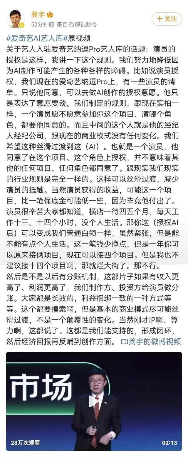 近期,关于爱奇艺推出AI艺人库及“纳逗Pro”系统的讨论,在行业内持续发酵。随着多位艺人就肖像授权问题接连辟谣,平台一时间被推上了风口浪尖。4月21日,爱奇艺创始人、CEO龚宇通过微博发文,对相关争议作出了详细回应。