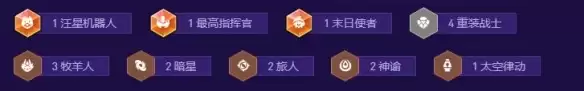 英雄集齐后,将激活完整的羁绊体系:1汪星机器人、1最高指挥官、1末日使者、4重装战士、3牧羊人、2暗星、2旅人、2神谕者、1太空律动。这套羁绊组合为阵容提供了坚实的防御基底与多维度的输出支持。