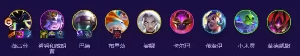 阵容的完全体需要以下九名英雄:薇古丝、努努、巴德、布里茨、娑娜、卡尔玛、俄洛伊、小木灵、莫德凯撒。
