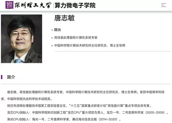 ▲唐志敏在深圳理工大学算力微电子学院的简介
