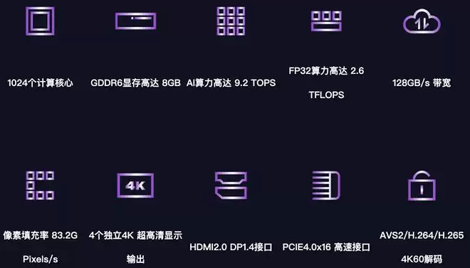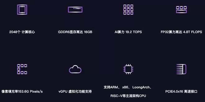 面向工控、嵌入式及边缘计算市场的“天钧二号”GPU于2024年11月发布。其配备8GB GDDR6显存,带宽最高128GB/s,AI峰值算力9.2TOPS,FP32精度算力2.6TFLOPS。
