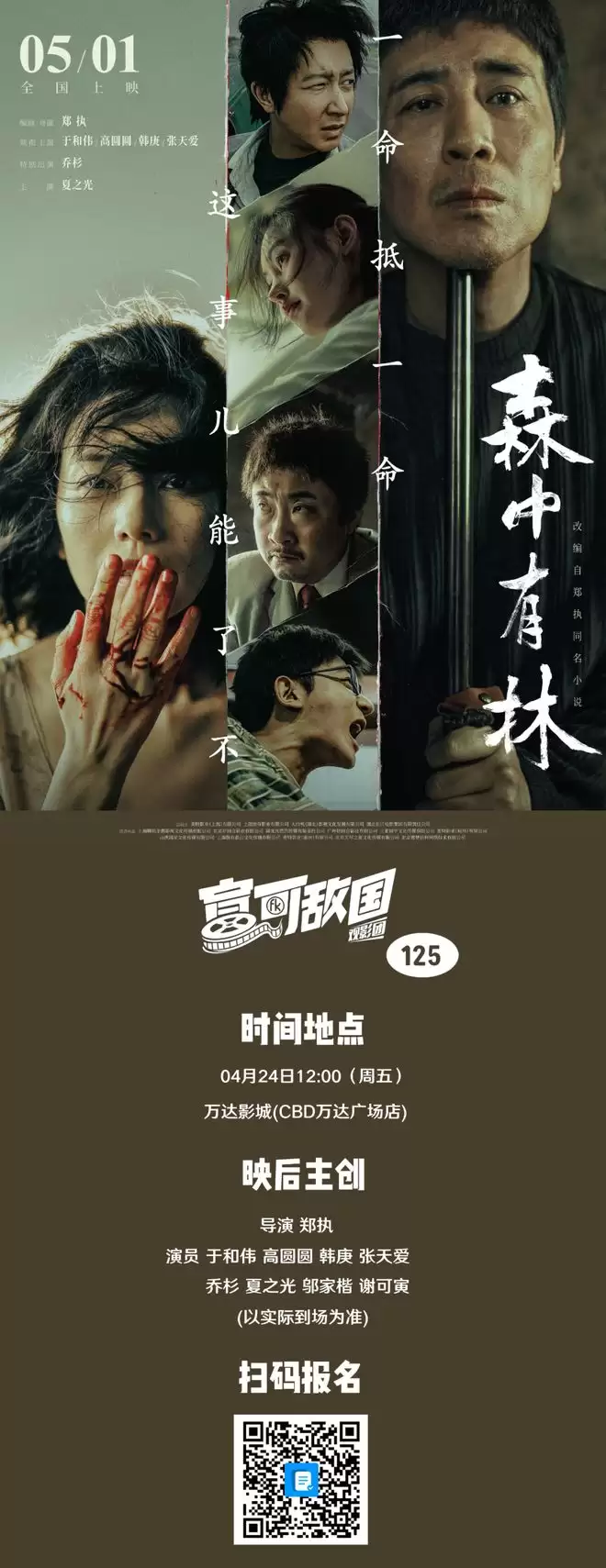 随着《森中有林》公映在即,我们也将为北京的小伙伴们争取到一次提前观影的机会。4月24日(周五),我们将组织专场观影,影片放映结束后,导演郑执及各位主演将亲临现场,与大家进行面对面交流。