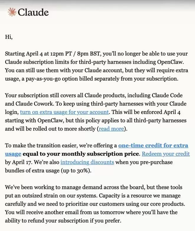 根据Claude最新发送的邮件,这项政策将首先在OpenClaw上强制执行,但其适用范围远不止于此。它针对的是所有第三方工具链,并且很快会推广到更多工具。这无疑给整个开发者生态投下了一颗震撼弹。