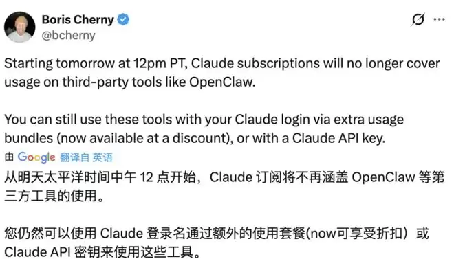 为什么要对OpenClaw下此“封杀令”?Anthropic的Claude Code负责人Boris Cherny在社交媒体上连发数条推文,给出了官方解释。