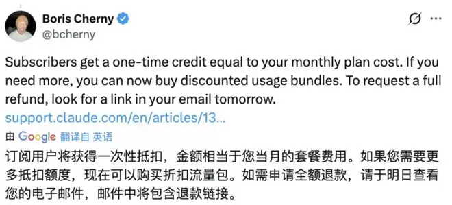 当然,Anthropic也并非全然不顾现有用户。公司提出了一些补偿措施:受影响的订阅用户将获得一次性等额月费积分。如果需要更多使用额度,现在可以购买折扣使用包。而对于希望彻底退出的用户,官方将在后续邮件中提供申请全额退款的链接。