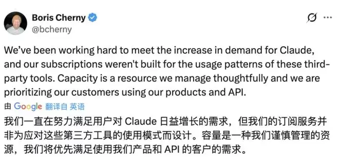 他提到,面对Claude日益增长的需求,Anthropic一直在努力平衡资源。其订阅服务的初衷,本就不是为了支持第三方工具的高频、自动化调用模式而设计的。在算力成为核心战略资源的当下,保障自家产品和API客户的体验与权益,成为了公司的首要任务。