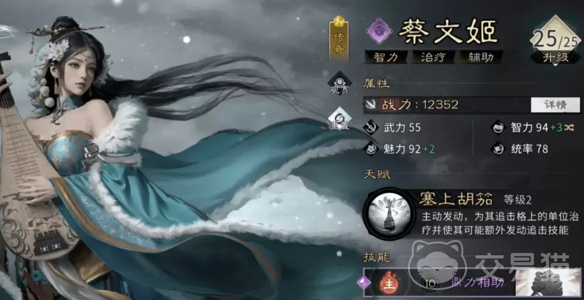 蔡文姬是前期很容易到手,且成长曲线非常平滑的群体辅助。她的天赋“塞上胡笳”在主动行动时,能为追击格内的友军恢复等同于自身100%攻击力的生命值,并挂上一个“余音”效果。这个效果能在追击技命中后,有一定概率让技能再触发一次,相当于变相增加了出手频率。她的觉醒技“五音共鸣”则是团队续航的保障,能量满时为全体队友恢复128%兵力,并且有25%的概率随机赋予一人一项增益:可能是提升10%暴击率的“宫”,也可能是提升36%爆伤的“商”,或是提升10%命中的“角”,以及提升8%闪避的“徵”。这种多维度、随机性的支援,让队伍的持续作战能力变得相当扎实。