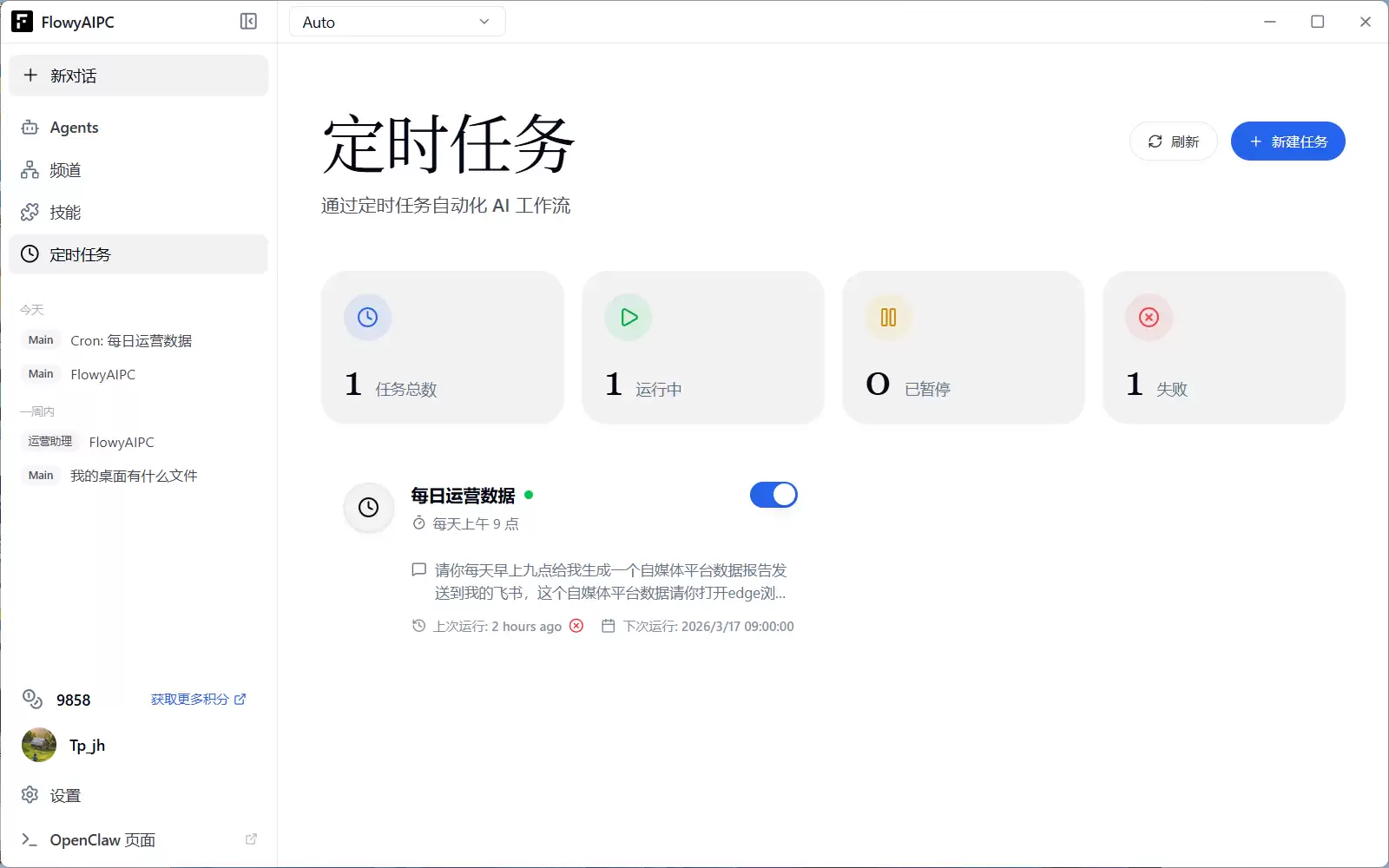 除了即时响应,FlowyAIPC v5.0还具备定时任务功能。你可以预设任务在指定时间自动运行,比如每日抓取行业资讯、定期整理数据生成报告、循环执行自动化流程或定时激活某个Agent。
