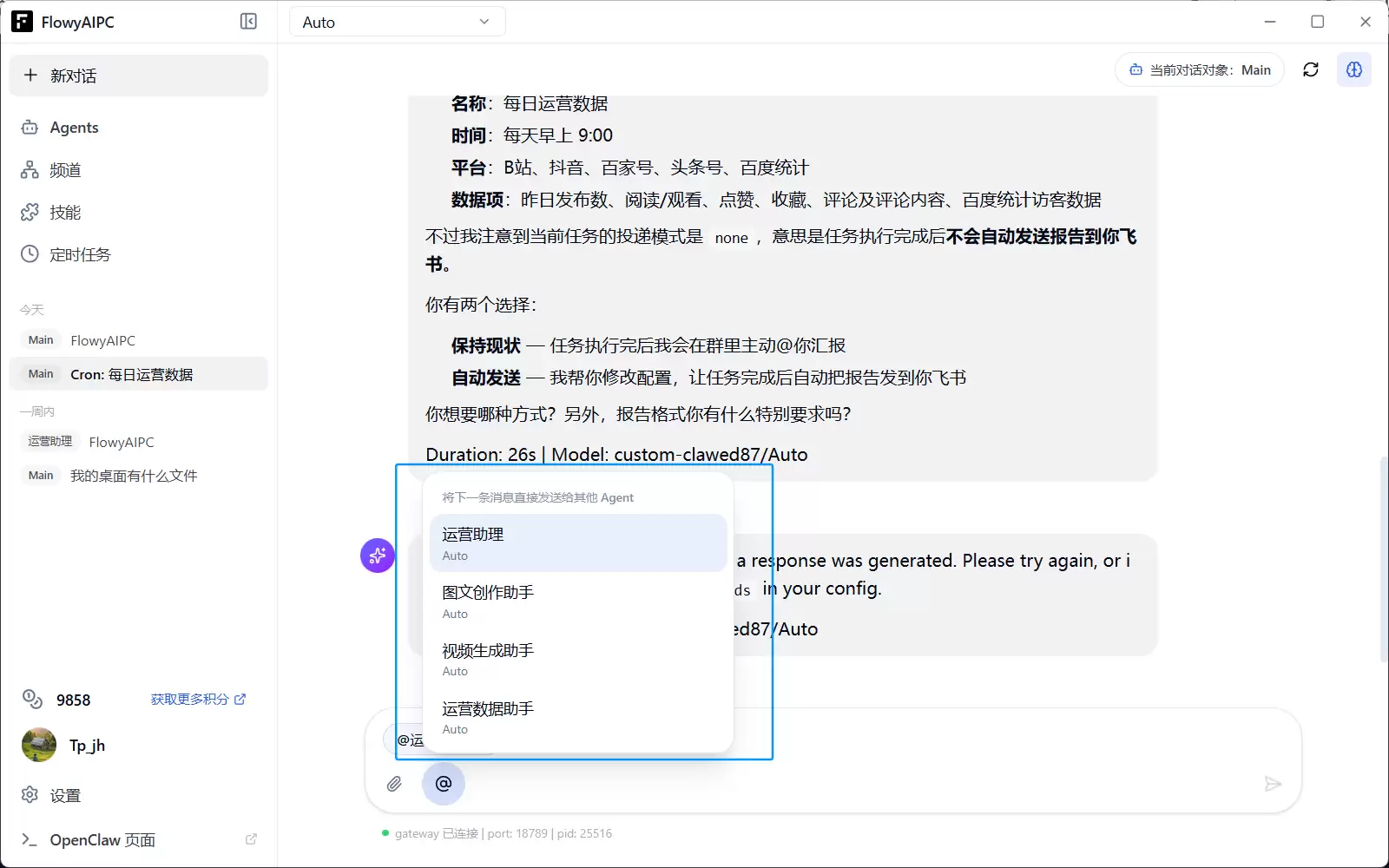 在聊天界面中,只需@对应Agent就能调用专属能力。更妙的是,每个智能体都拥有独立记忆系统,就像组建了一支各司其职的AI团队。