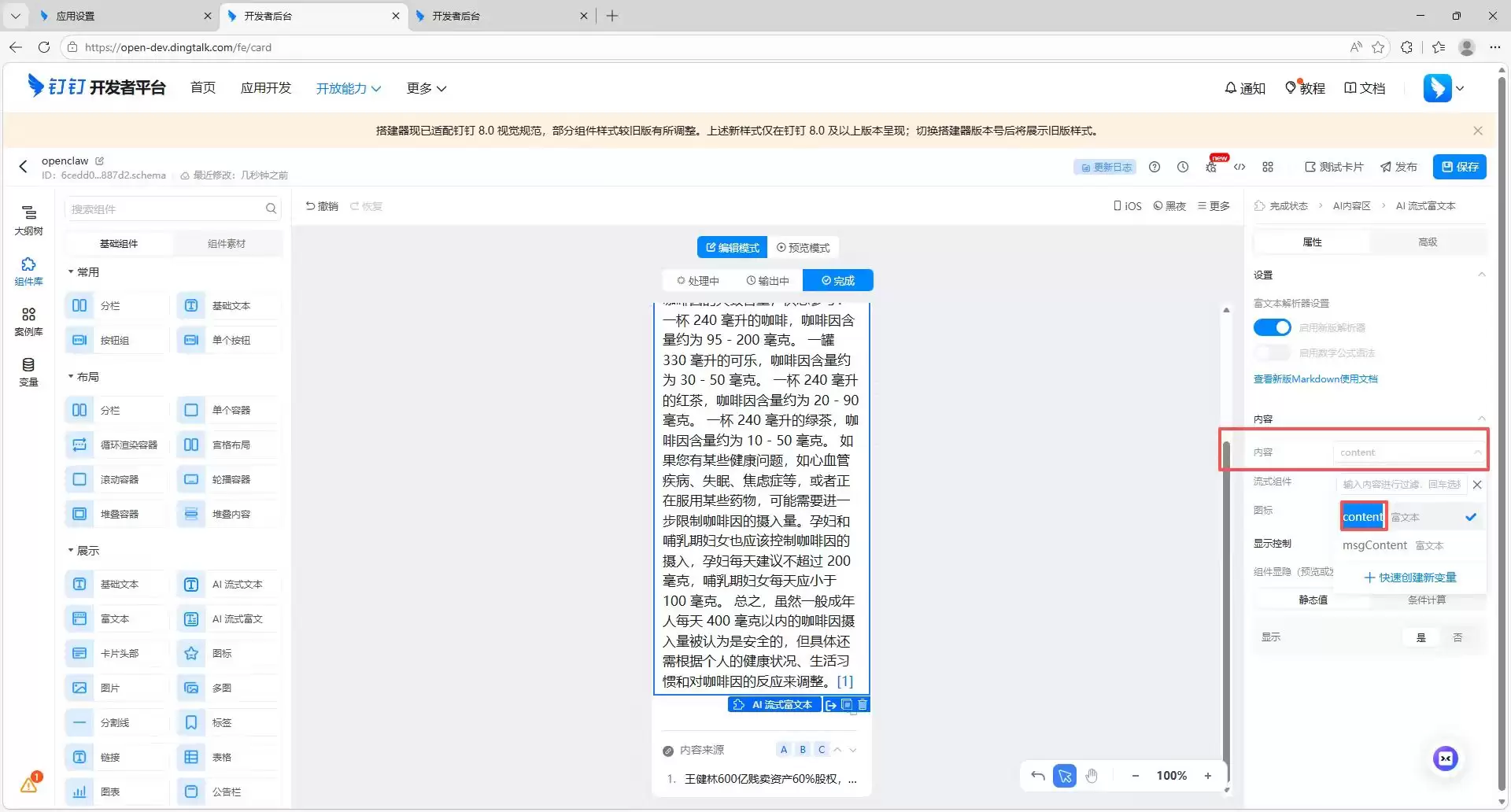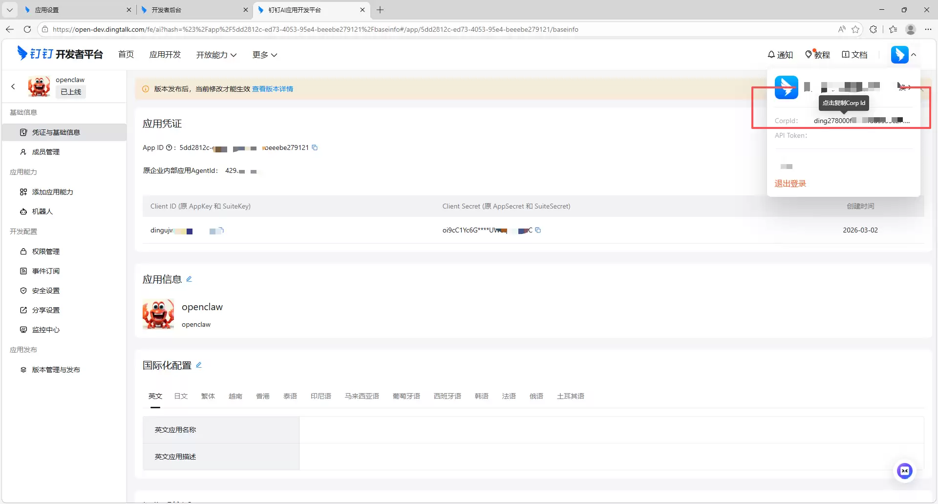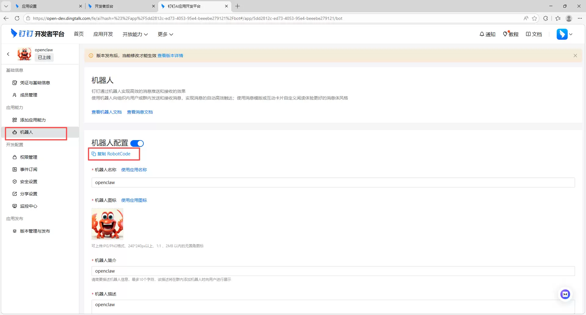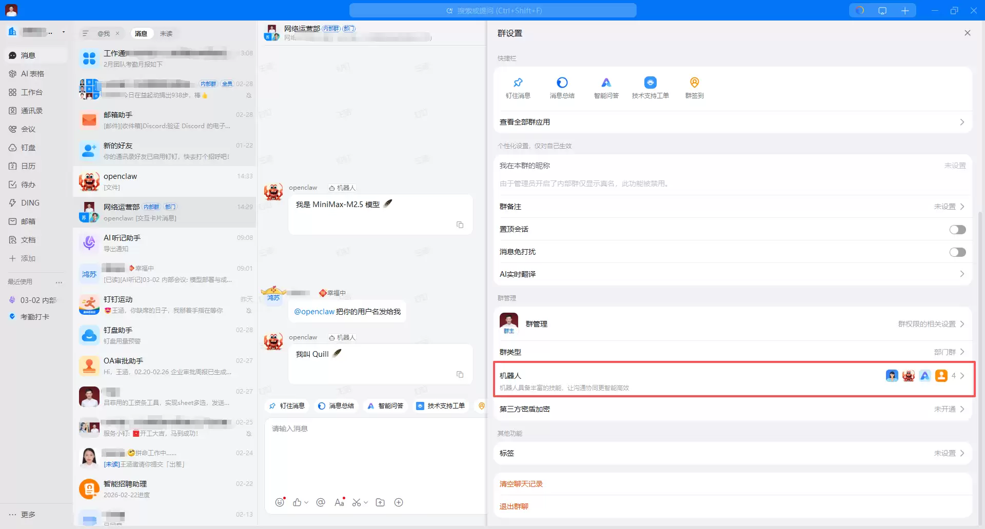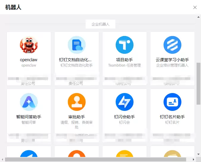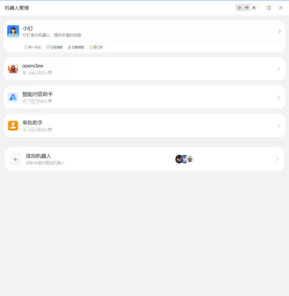 open(开放给所有人)或 allowlist(仅白名单用户可用)。open(开放)或 allowlist(白名单)策略。全部配置妥当之后,就可以去钉钉聊天里配置机器人了。找到对应的机器人,完成最后的关联设置。