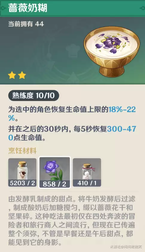 第三款,是来自莱伊拉的特色料理【蔷薇奶糊】。必须提一句,这道甜品的设计,确实很符合这位星辰学者的优雅与梦幻气质。它的主体食材牛奶和糖可直接购买,至于须弥蔷薇,除了在须弥地区采集,还有一个更省心的办法:利用尘歌壶的“薿此芝田”进行种植。如果你正好有两块田不知道种什么,须弥蔷薇是个不错的选择。而当你用莱伊拉本人烹饪时,有概率做出特殊料理【安眠畅想】,其恢复效果直接逼近三星料理的水平,非常可观。