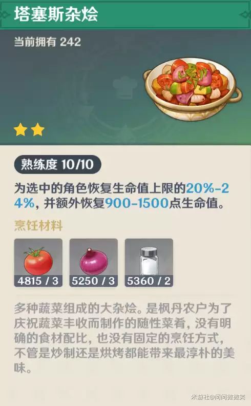 接下来推荐【塔塞斯杂烩】。这道料理最大的好处,在于其食材的稳定来源——番茄、洋葱和盐全部可以通过各国商店直接购买,真正实现了“量产自由”。对于不喜欢满地采集的旅行者来说,这无疑是保证背包里恢复品库存的最佳选择之一。