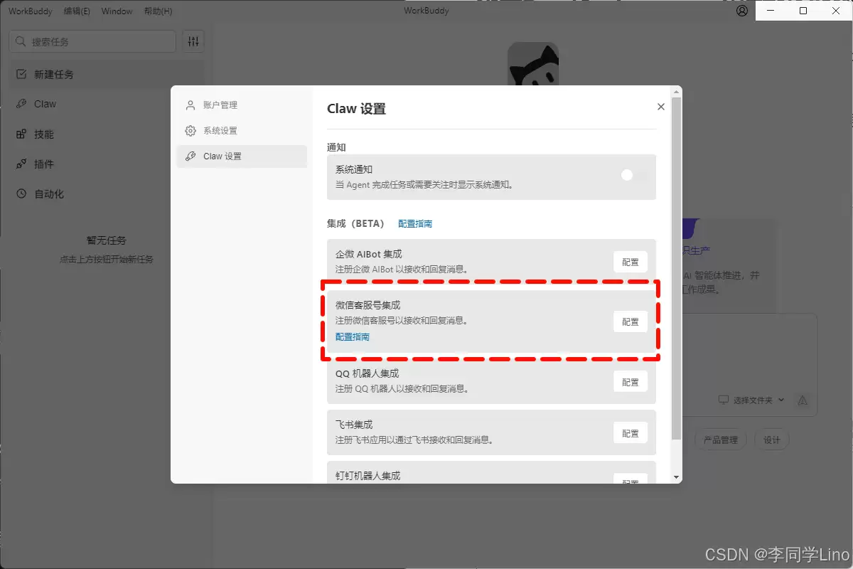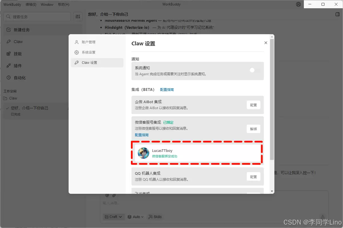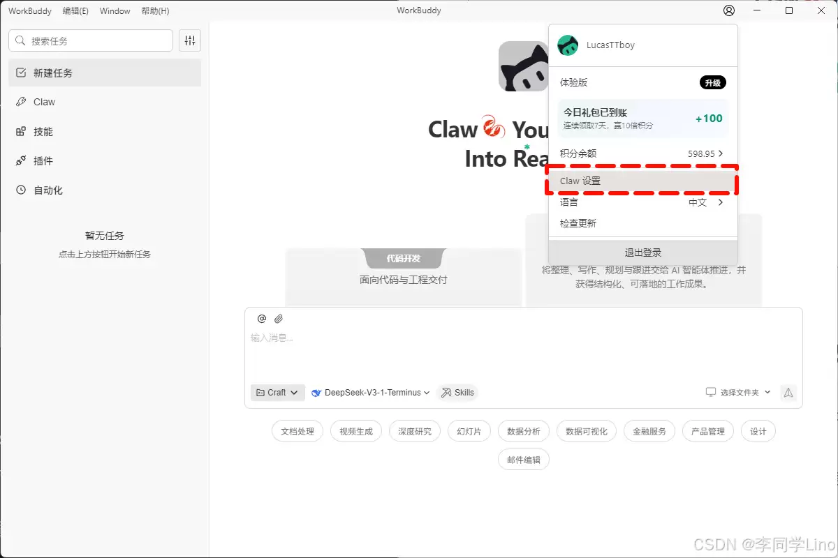 这是最关键的一步!回到 WorkBuddy 主界面,点击右上角的个人头像,进入「Claw 设置」。