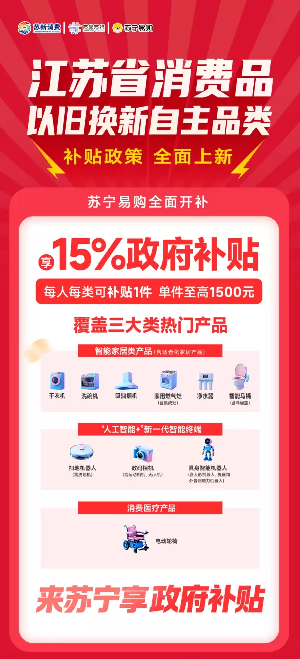 江苏省2026年消费品以旧换新政策已进入执行阶段,其地方自主品类补贴方案率先于苏宁易购平台完成落地。本次政策的核心突破在于补贴范围的战略性扩展,智能家居、“人工智能+”新一代智能终端及消费医疗产品均被纳入。消费者最高可累计享受1.5万元的补贴额度,政策扶持力度显著。