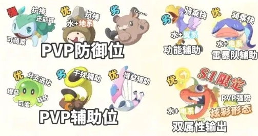果冻:外形可爱的辅助精灵,拥有多个分支进化,能灵活应对不同战局。在PVP中间出场率较高。