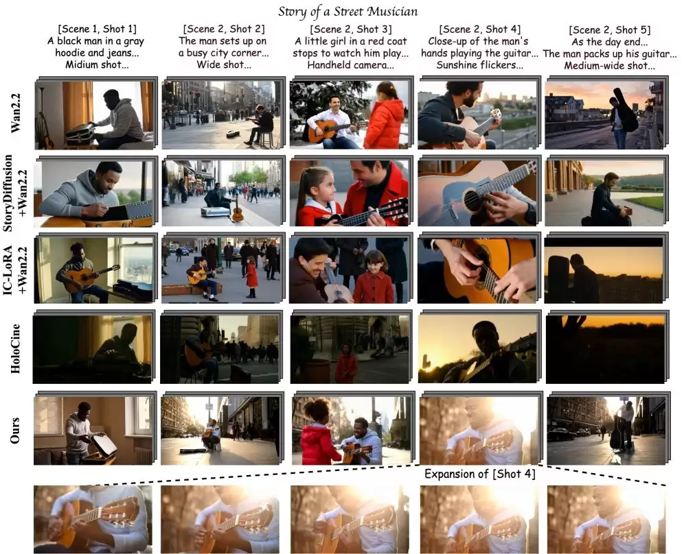 值得注意的是,它在实现这一突破的同时,还完美继承了如Wan2.2等优秀基础模型的高画质基因,并且对用户提示词的理解异常精准。无论是自然的场景转场,还是复杂的推拉摇移运镜,处理起来都游刃有余。为了更全面地验证其能力,研发团队甚至专门构建了一套包含300个复杂场景的“ST-Bench”基准测试集。这一举动,摆明了是要在长叙事视频生成这个赛道上,树立一个全新的、更严格的评价标杆。