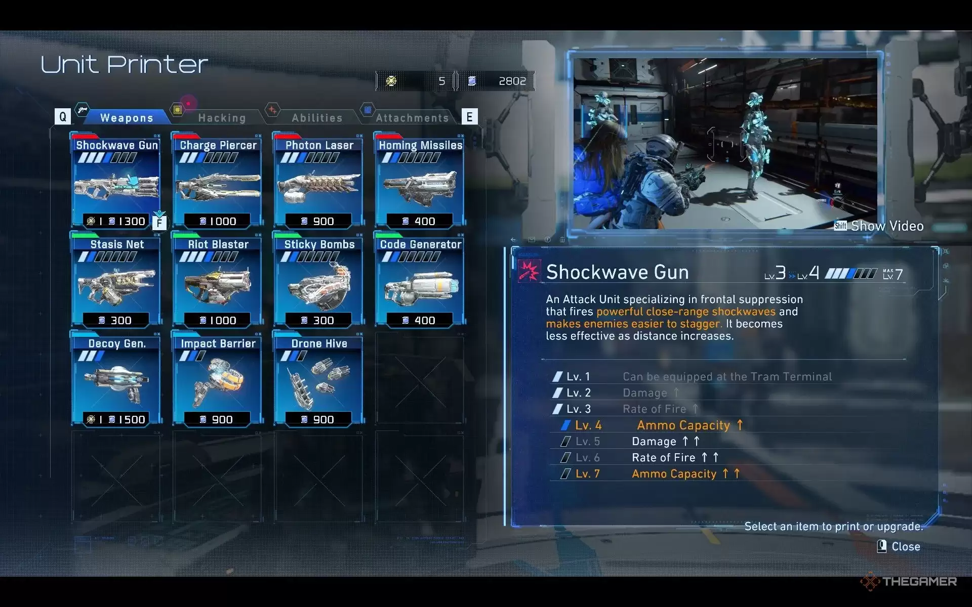 但如果你能贴近射击,冲击波枪的伤害堪称恐怖。尤其是在通过单元打印机升级其弹药容量和充能时间后。先用黑客破解让机器人进入脆弱状态,再贴近用冲击波枪轰击,许多低级敌人往往一击毙命。