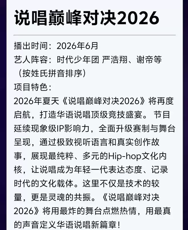 节目阵容同步揭晓,迎来两位关键嘉宾:严浩翔与谢帝。他们截然不同的音乐风格与舞台表现力,将直接重塑本季的竞争格局,大幅提升赛事悬念与专业看点。据悉,节目定档六月上线,这场巅峰音乐对决已进入开播倒计时。