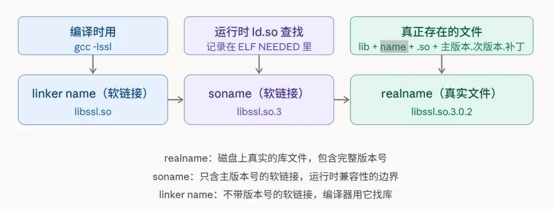 接下来是动态库最让人迷惑的地方:一个库,怎么会有三个名字?搞懂这三个名字的“分身术”,你再看libssl.so.3.0.2这样的命名,就完全通透了。