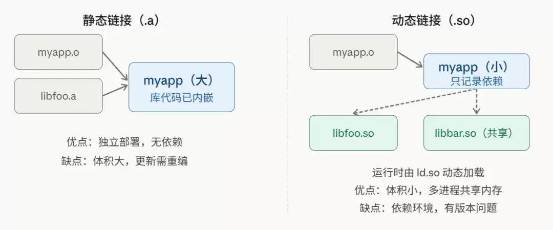 静态库(.a文件)很好理解:链接时,编译器直接把库里的代码“复制粘贴”到你的可执行文件里。最终生成的是一个自给自足的“大胖子”二进制,运行时不依赖任何外部文件。