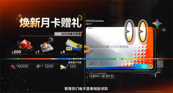 除了登录奖励,本次版本还将同步上线“焕新月卡”活动。这可不是传统的付费月卡,而是一个持续30天的签到福利。玩家通过每日签到,就能累计获得嵌晶玉、理智以及各种消耗券等资源。用玩家社区的话说,这波可谓是“全民月卡”了,诚意十足。