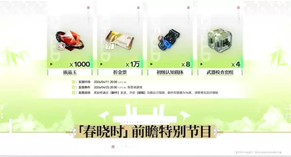 领取方式非常简单:奖励将于4月11日晚8点起发放,只要在4月25日晚8点前登录游戏即可领取。而版本预计更新时间点,大概率定在4月17日。