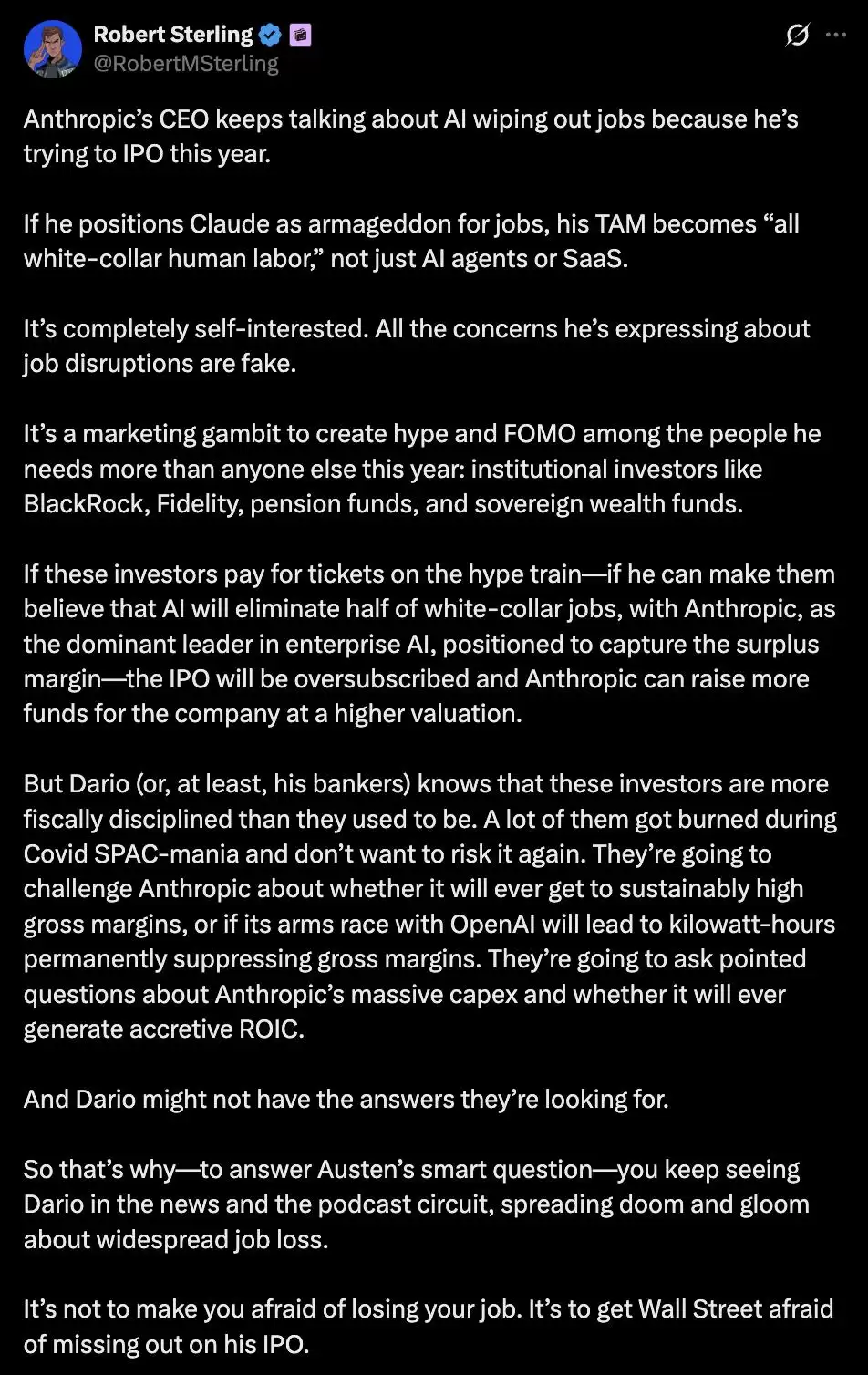 这便是冷酷的资本逻辑。如果Anthropic的故事仅停留在「一个提升编码效率的SaaS工具」,其估值天花板或许仅数百亿美元。但如果它能「接管人类半数白领工作」,成为新的社会基础设施,其想象空间便是万亿美元量级。他不断渲染「AI摧毁白领岗位」,真正意图恐吓的并非打工人,而是唯恐错过下一场工业革命的华尔街资本。