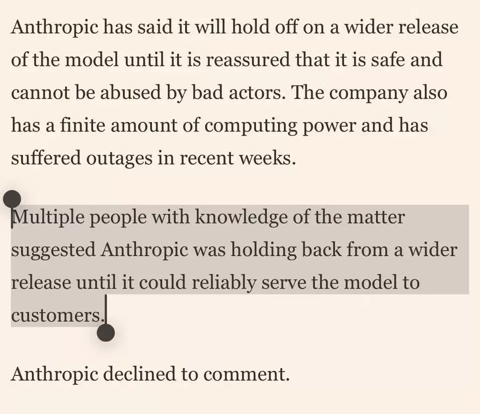 直到英国《金融时报》(FT)毫不留情地揭开了这层「安全主义」的面纱。FT引述多位知情人士的爆料,戳破了这一叙事:真正阻碍模型广泛部署的,与其说是「过于危险不敢释放」,不如说是「资源消耗巨大,根本无力承载」。
