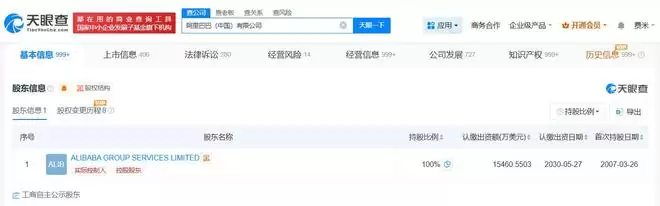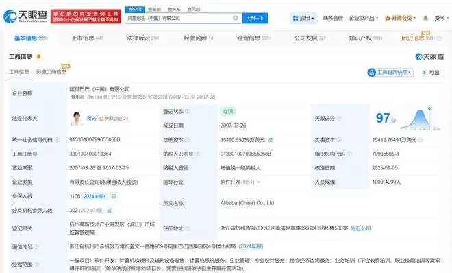 本次商标的申请方阿里巴巴(中国)有限公司,是阿里系的核心运营主体之一。该公司成立于2007年3月,法定代表人蒋芳,注册资本约1.5亿美元。其业务范围覆盖软件开发、计算机系统服务及软硬件零售等科技核心领域,由ALIBABA GROUP SERVICES LIMITED全资控股,资本与技术背景深厚。