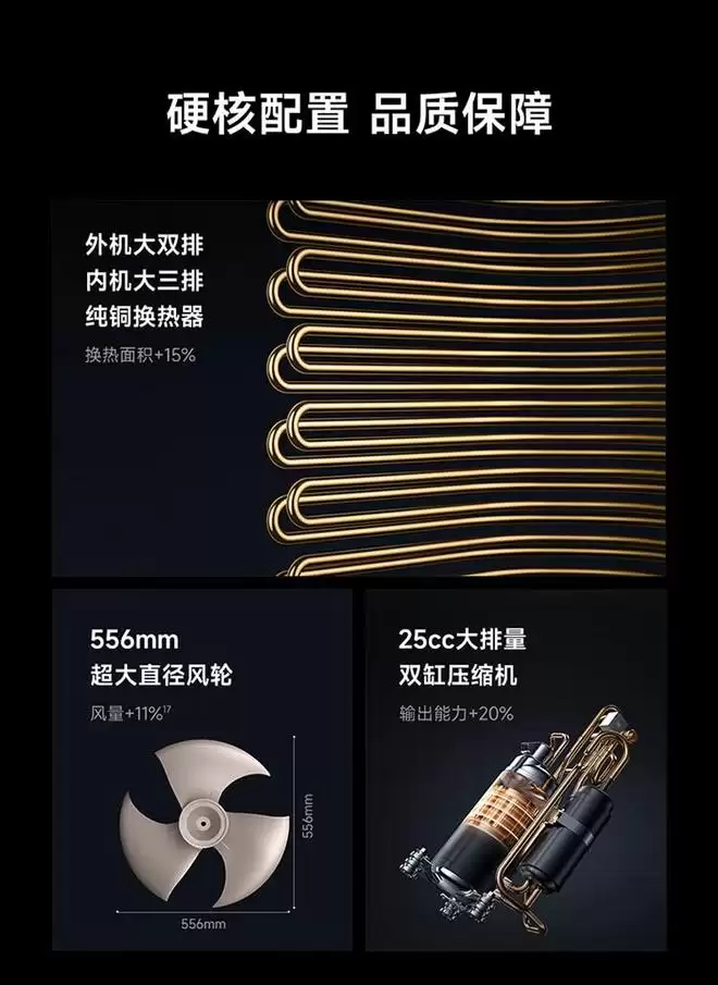 在能效表现上,该机型达到超一级能效标准,全年能源消耗效率(APF)高达4.62。其硬件配置扎实:室外机采用大双排设计,室内机配备大三排纯铜换热器,整体换热面积提升15%,为高效制冷制热提供了核心保障。基于此硬件可靠性,厂商提供了长达十年的免费包修服务,展现了强大的产品信心与市场竞争力。