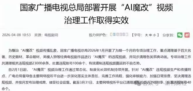 然而,市场需保持清醒:AI降低的是制作门槛,而非做出优质内容的门槛。国家广播电视总局在2026年1月的“AI魔改”专项治理中,清理违规视频23000余条,处置违规账号100余个。这明确了监管边界:AI内容发展不能无边界扩张,经典作品、历史题材与主流价值内容绝非可任意戏说的素材库。