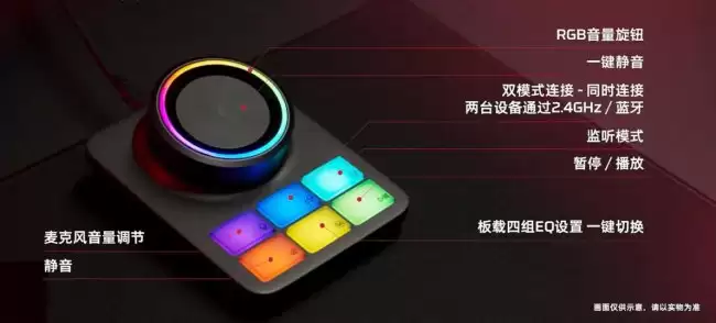 最引人注目的是,它附带了一个全球首创的可编程RGB控制台。这个控制台不仅带有炫酷的RGB灯效旋钮,还集成了六个可自定义的按键。通过它,你可以直接控制音量、一键静音、切换EQ模式,甚至实现麦克风监听和多设备管理。所有这些功能,都可以通过HyperX Engine软件进行深度自定义,把个性化的操控权完全交给用户。