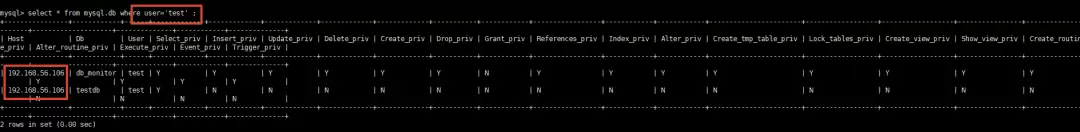 你只改了user表的host,但db表里对应的权限记录,关联的host可能还是旧的‘192.168.56.106’。即便执行了FLUSH PRIVILEGES,内存里加载出来的关联关系也是错位的。这就导致了那个诡异的现象:从新IP(192.168.56.108)登录的用户,在检查db表权限时,找不到匹配‘test’@‘%’的记录,所以没有任何库权限。