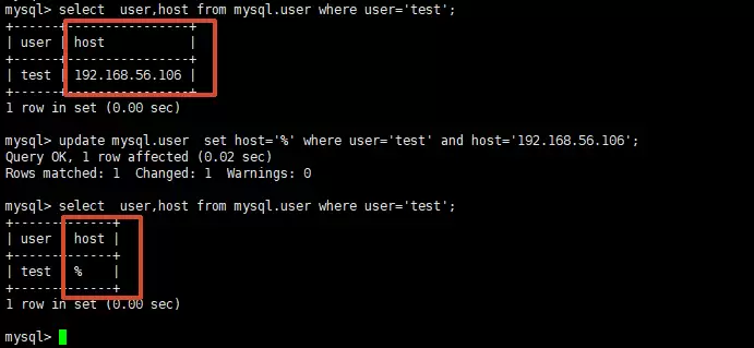 mysql> update mysql.user set host='%' where user='test' and host='192.168.56.106';Query OK, 1 row affected (0.02 sec)Rows matched: 1 Changed: 1 Warnings: 0
