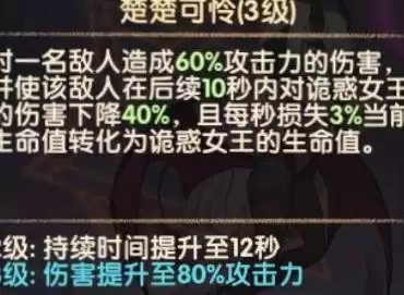 技能升到2级后,能阻止敌人通过攻击来回能,但他们依然可以通过受伤或者被动效果获取能量。另外值得注意的是,敌人处在魅惑状态下时,他们受到的伤害是不会触发魅魔的吸血效果的。
