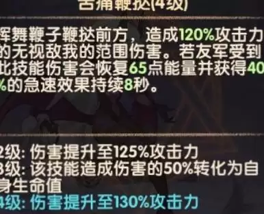这个技能的真正价值在于辅助——它能给队友加急速、回能量。输出能力虽然一般,但它可是游戏中少数能对己方单位生效的特殊技能。有意思的是,如果鞭子不小心打到了队友,甚至会导致队友阵亡,并返还能量。技能描述里提到的40%急速,可以直接理解为40点急速属性。