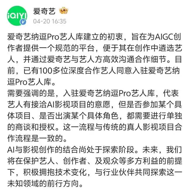 爱奇艺紧急公关,声明入库艺人仅表达“有接洽AI影视项目的意愿”