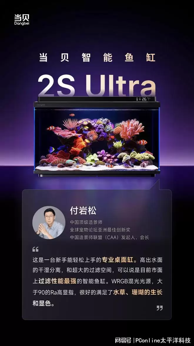 作为中国造景师联盟的发起人兼会长,付岩松在圈内以其严苛的评判体系著称。对于当贝鱼缸2S Ultra,他给出了一个极具分量的结论:“这是目前市面上过滤性能最强的智能鱼缸。”资深玩家立刻能领会这句话背后的技术含金量。他特别强调了两个核心设计:一是采用高出水面的干湿分离结构,水流优先经过物理过滤层再回落缸内,从根本上杜绝了有机物在水下长期腐化导致的水体污染风险;二是超规格的过滤仓容积,为容纳更丰富、更多元的生化滤材提供了充足冗余,确保了水质长期稳定的生化过滤基础。在灯光系统上,WRGB多光谱混光技术与Ra>90的高显色指数相结合,为水草光合作用与珊瑚发色提供了理想的光环境。在专业造景领域,显色指数直接决定了水生植物在缸内的色彩饱和度与质感表现,Ra值突破90,意味着彻底解决了普通灯具下景观色彩暗淡、失真的普遍痛点。