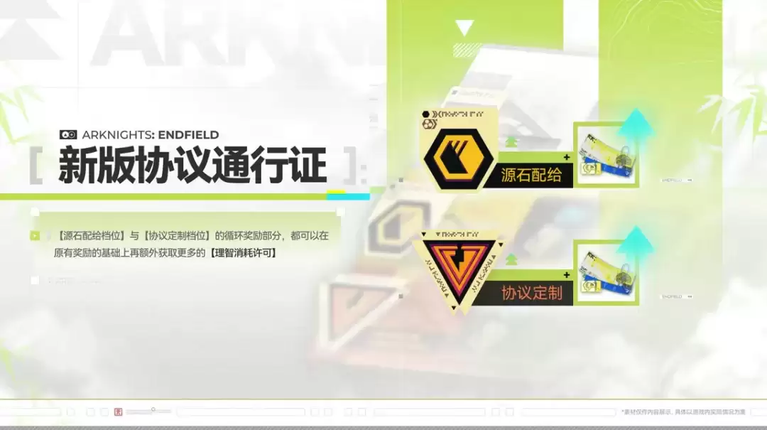 除了月卡,协议通行证也迎来了小幅调整。新版通行证将在“源石”和“定制”两个档位中,额外增加“理智消耗许可”作为奖励。这相当于在原有的养成资源体系外,又开辟了一条稳定的“体力”补给线,进一步缓解了角色培养过程中的资源压力。
