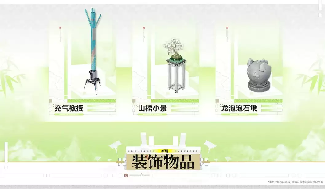 其中,“山樆小景”可通过免费途径获取,而“充气教授”和“龙泡炮石墩子”则需要使用调度券购买。对于热衷截图和摄影的玩家而言,这无疑是个好消息。这些装饰物品允许你在基地或特定场景中自由摆放,随心搭配,创造出独一无二的构图与游戏记忆。