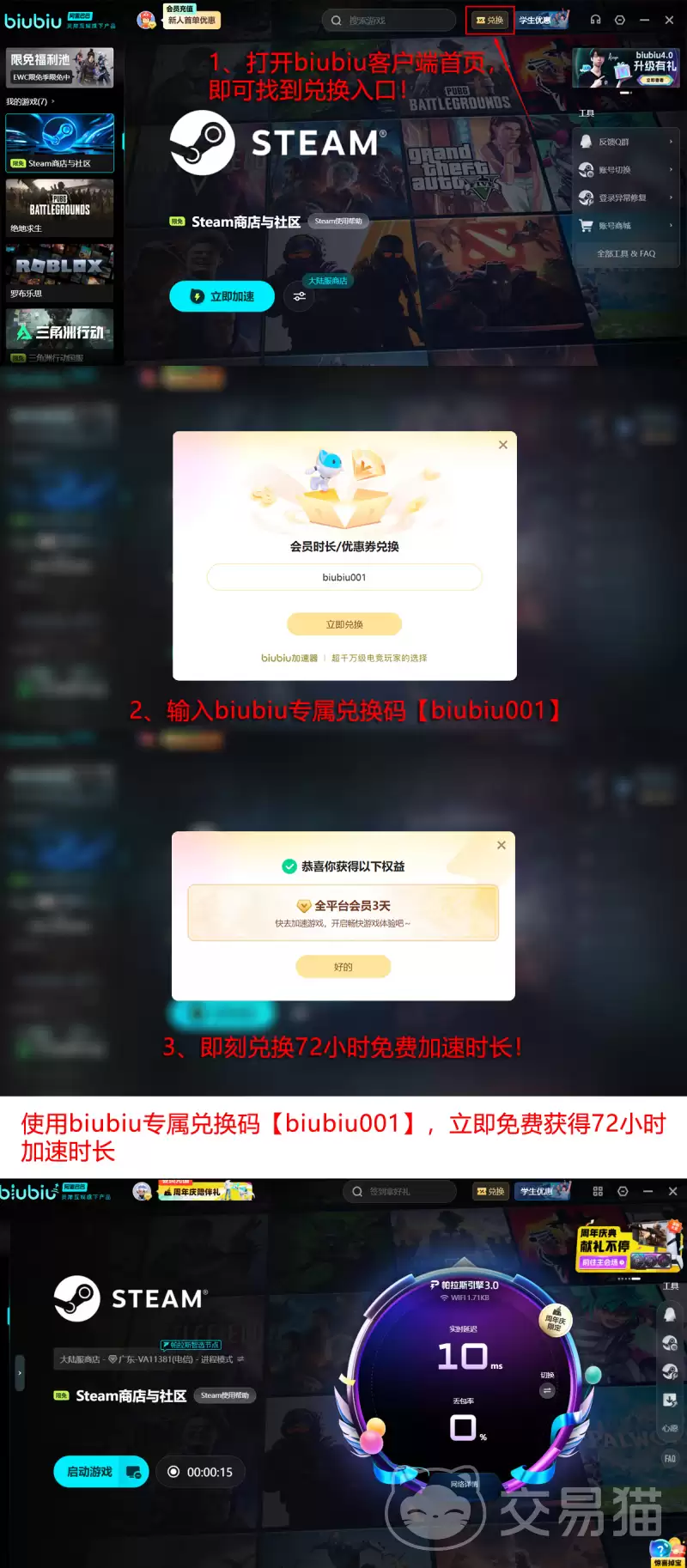 好消息是,目前Biubiu翻跟斗正提供限时福利。新用户注册即可获得24小时的免费加速时长。如果再输入通用兑换码【biubiu001】,还能额外领取3天的加速权益。新老用户均可叠加使用,累计最高能享受长达96小时的无门槛加速服务。这意味着,在游戏上线初期,你完全可以在无需付费的情况下,就能获得流畅的联机与验证体验。