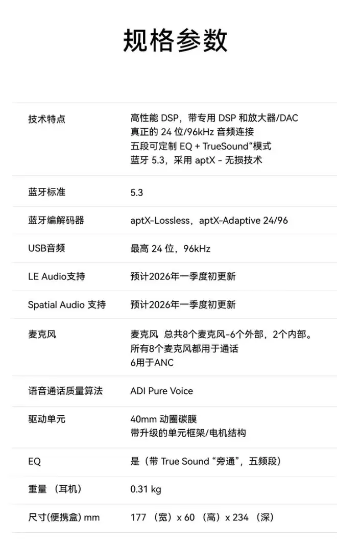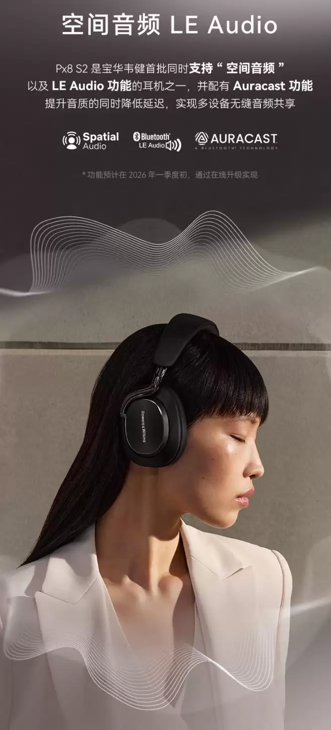 音质表现始终是旗舰耳机的核心。Px8S2保留了经典的40mm碳膜单元,但内部驱动架构全面升级,搭载了全新的数字信号处理器(DSP)与放大单元。这套硬件组合旨在实现更精准的声音还原与更低的谐波失真。无线编码方面,它支持aptX Adaptive(24-bit / 96 kHz)及aptX Lossless,为高解析度无线音频传输提供了基础。更具前瞻性的是,官方确认后续将通过OTA固件更新,加入LC3与Auracast编码器支持,为未来的沉浸式音频体验做好了技术铺垫。