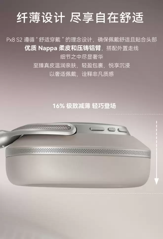 作为Px8的迭代升级型号,Px8S2在多个维度进行了优化。其整体重量进一步减轻,显著降低了佩戴时的头部压力。头梁结构经过重新设计,旨在提供更贴合、更舒适的长时间佩戴感受。材质选择维持了品牌一贯的高端定位:机身采用触感细腻的Nappa皮革包裹,耳垫为柔软的记忆海绵,结合铝制支臂,在轻量化与结构强度间取得了平衡。耳罩和头梁均支持用户自行更换,这一模块化设计对于追求耐用性的用户极具价值,能有效应对日常磨损,延长耳机生命周期。