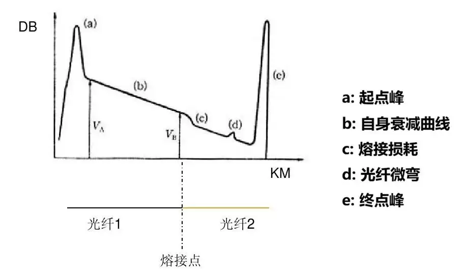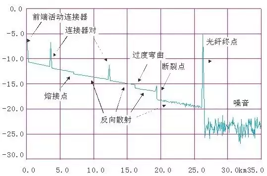 曲线起始端的反射峰由测试跳线与待测光纤的连接处产生。末端若存在裸露端面,也会形成明显的终点反射峰。两点之间线性区域的斜率,即为该段光纤的每公里衰减值。