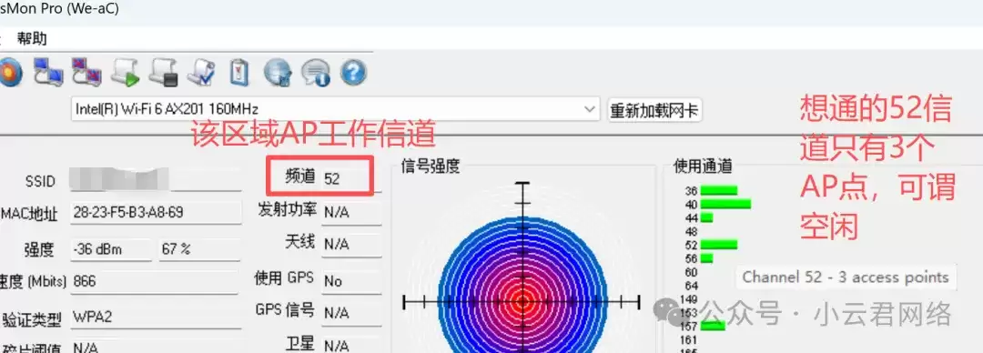 首先使用WirelessMon软件进行Wi-Fi环境扫描,排查同频干扰。