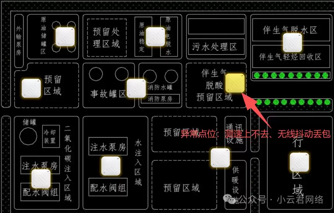 本次故障属于典型的局部性、频段选择性无线性能问题。核心特征是:在伴生气脱酸工艺区域,新部署的Wi-Fi 6 AP仅5GHz频段出现严重性能衰减,2.4GHz频段业务不受影响。这排除了网络链路中断等基础问题,将排查方向指向射频性能、干扰或环境兼容性等更深层因素。