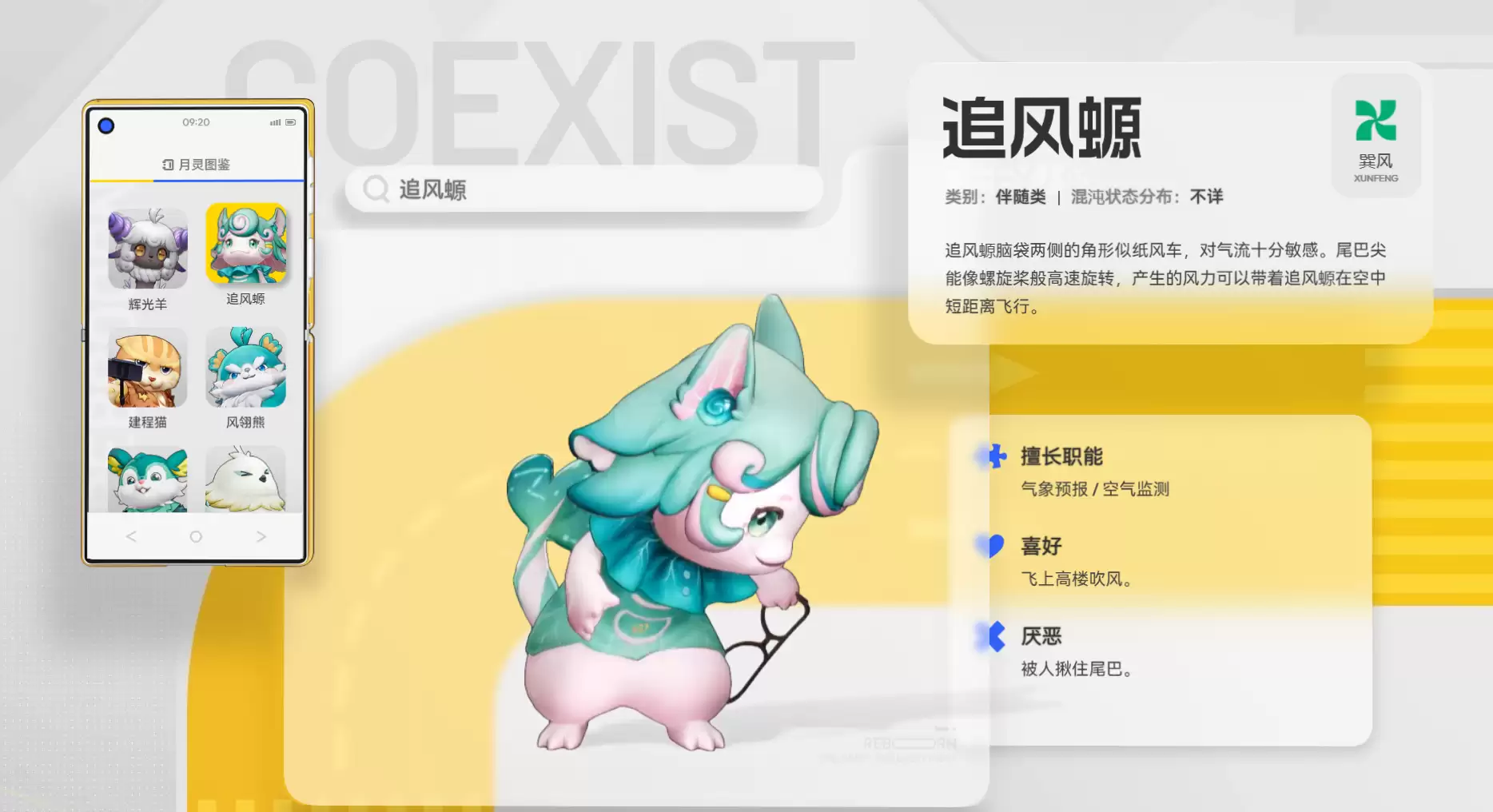 再来看看追风螈。拥有巽风属性的它,头部两侧长着对气流极其敏感的纸风车状角,尾巴尖更能像螺旋桨一样高速旋转,实现短距离飞行。它的核心功能在于天气与空气质量的实时预报与监测,为玩家出行提供精准的气象参考。追风螈最爱飞上高楼感受气流拂过,但非常讨厌被人揪住尾巴。与它相处,保持尊重、维持适当距离是关键。